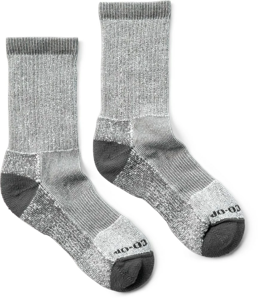 Designed to keep feet happy on the trail, REI Co-op COOLMAX EcoMade Light hiking crew socks wick sweat and breathe to help your feet keep their cool.