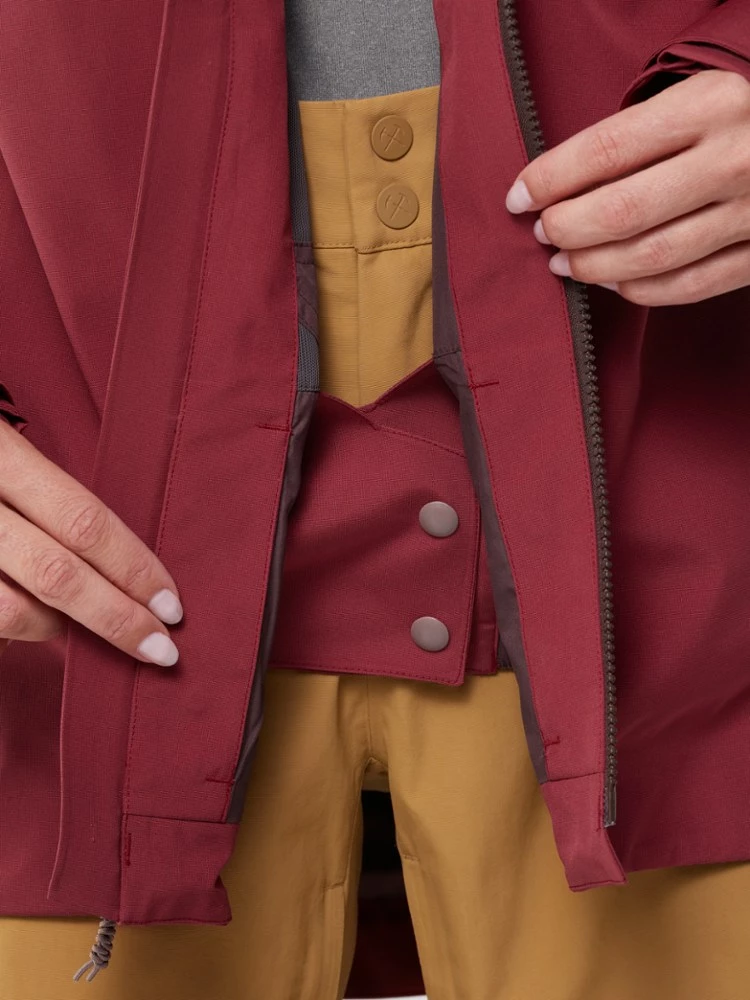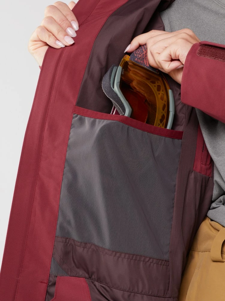 - Media port and plenty of pockets, including a lift pass pocket on wearer’s left wrist, a key clip in the left hand pocket and drop-in goggle pocket inside the wearer’s right