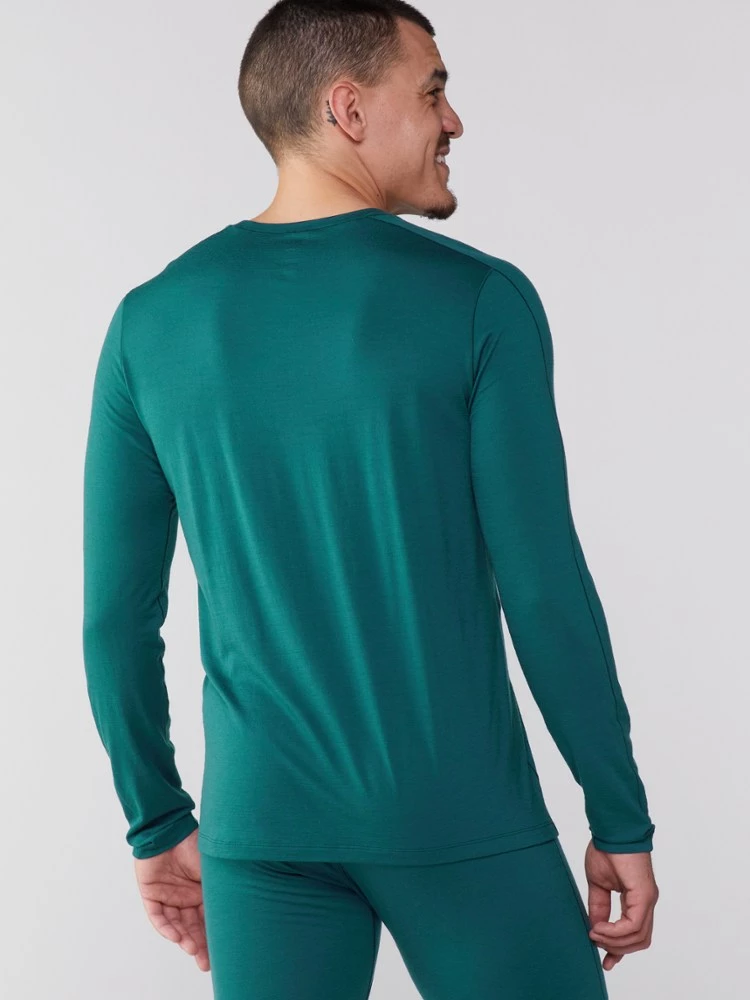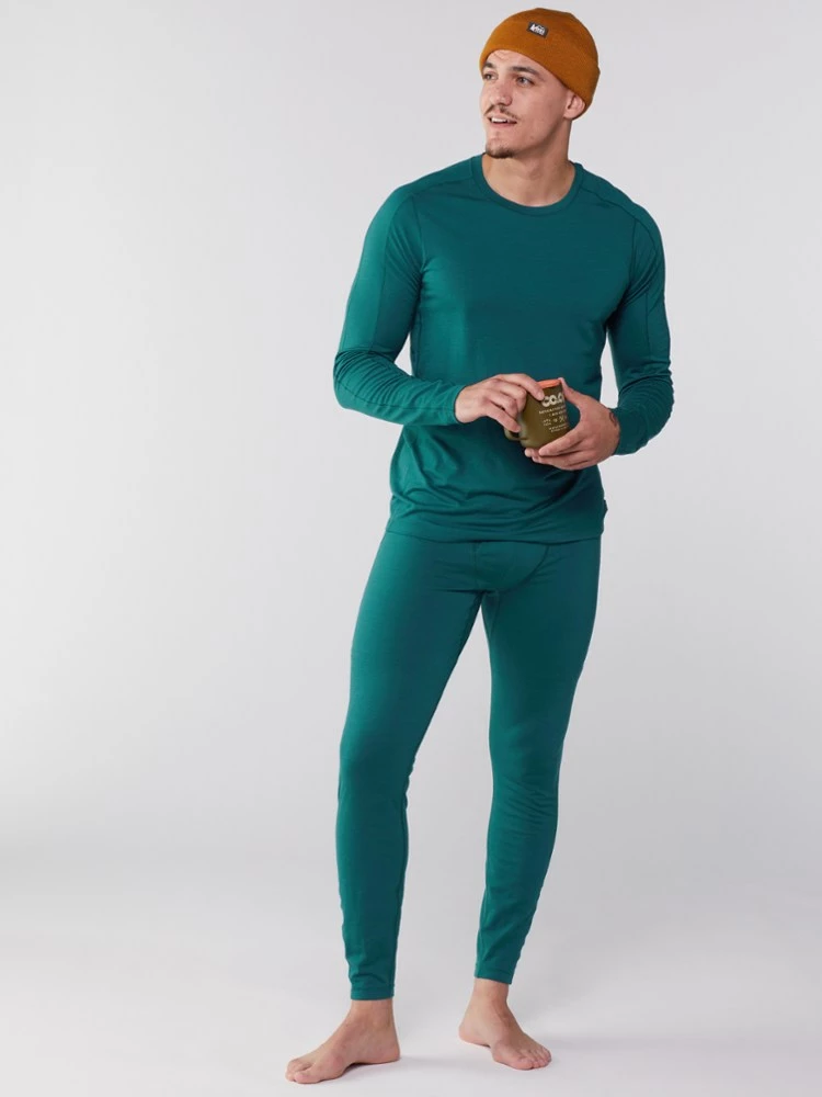 Soft, breathable and naturally odor resistant, the ultrafine merino wool of the men’s REI Co-op Merino 185 long-sleeve base layer top is beloved while sweating on the trail—and sleeping in the tent.