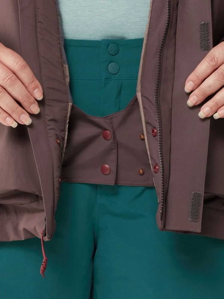 - Powder skirt snaps away when not needed; drawcord at hem helps seal out the elements