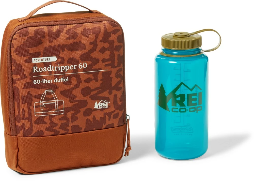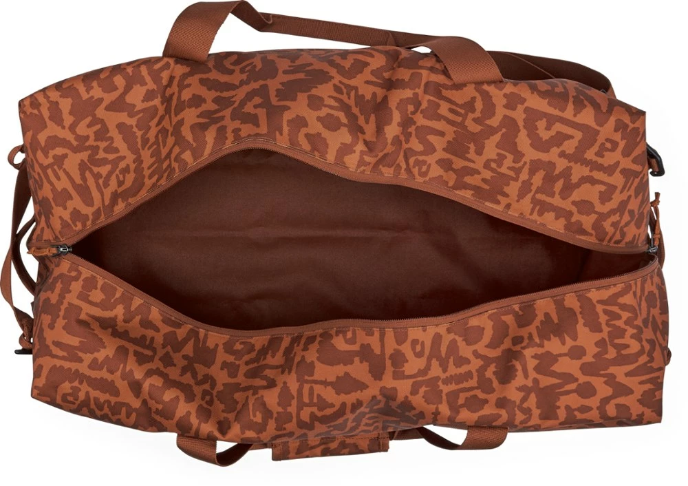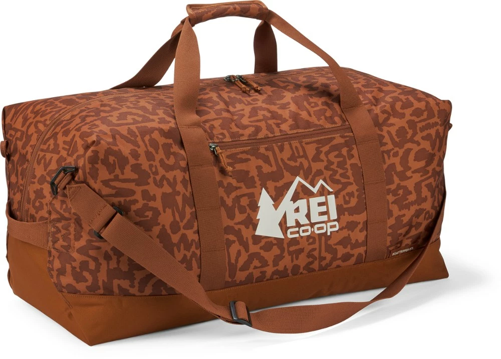 Cross-country or cross-continent, the REI Co-op printed Roadtripper 60 Duffel is happy in your rooftop box or trunk—or packed in its own cube in your luggage to handle souvenir overflow.