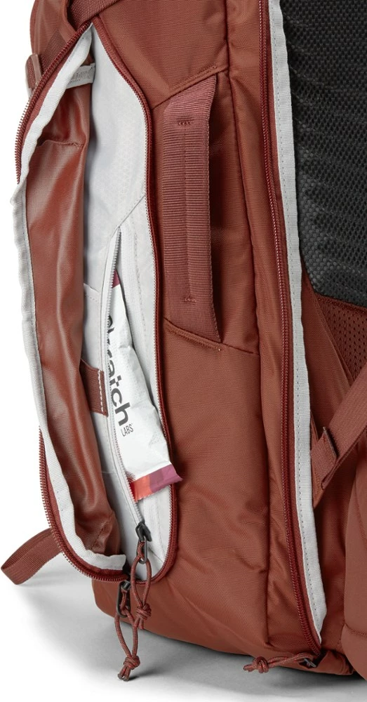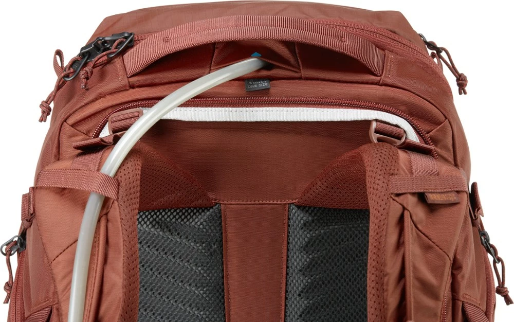 - Access port on the left side of the pack accommodates a hydration reservoir tube (reservoir not included)