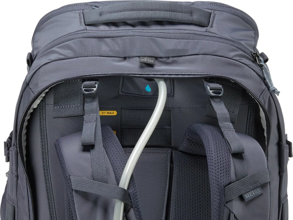 - Access port on the left side of the pack accommodates a hydration reservoir tube (reservoir not included)