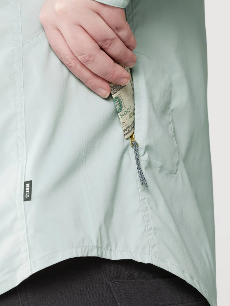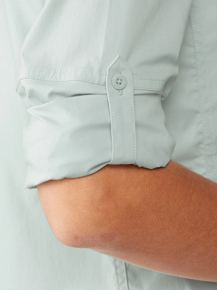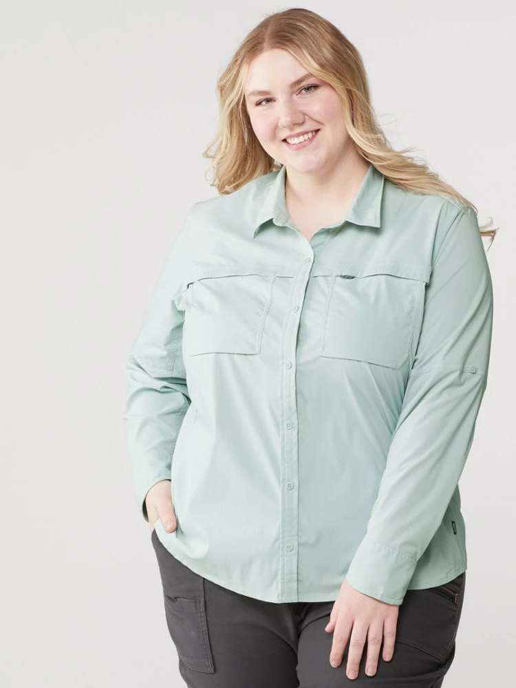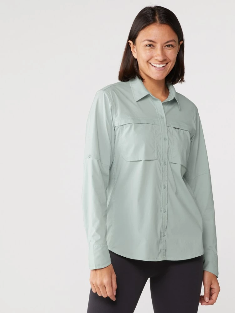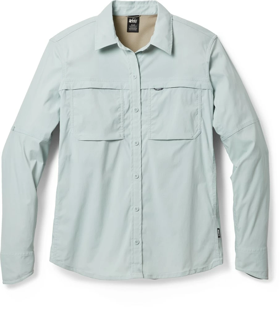 Beloved by thru-hikers and day hikers alike for its cool comfort and adjustable coverage, the women’s solid REI Co-op Sahara shirt travels well, too— it packs small and dries fast.