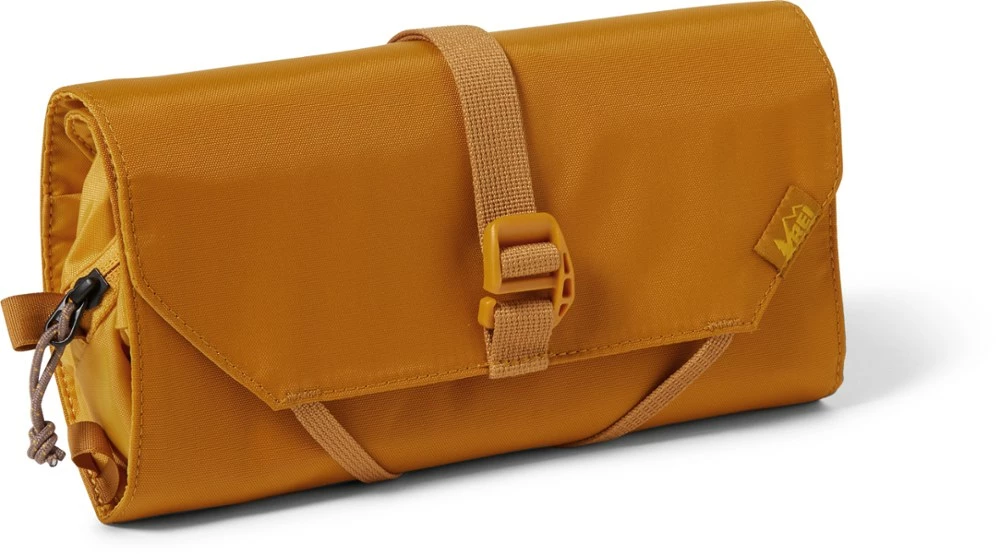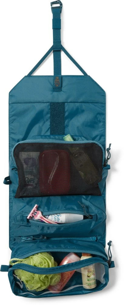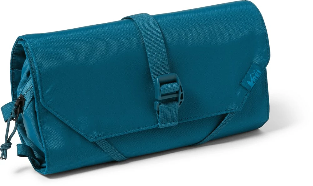 Unroll the REI Co-op large Shower Roll and hang it from a hook (or tree branch) when you get to your destination. It packs small and holds plenty of toiletries in 3 different types of pockets.