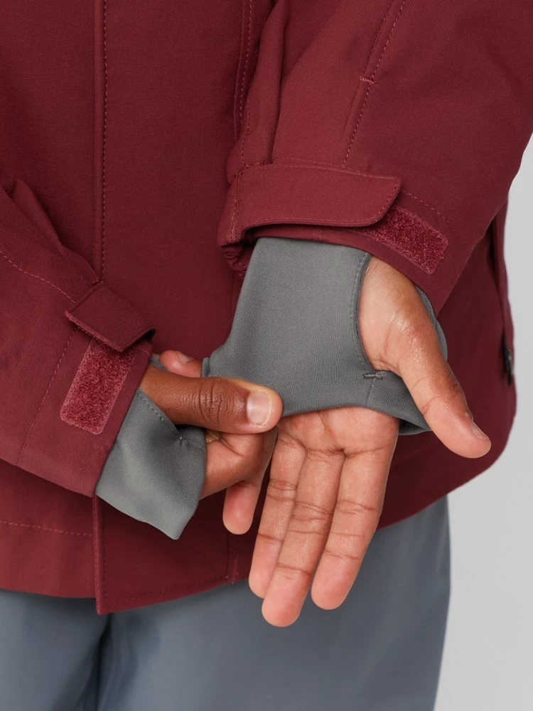 - Knit snow cuffs have thumbholes to keep sleeves in place